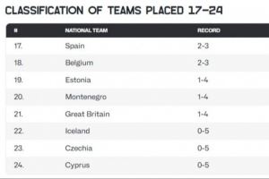 本届赛事17到24名的排名也最终确定,分别是西班牙、比利时、爱沙尼亚、黑山、英国、冰岛、捷克和塞浦路斯。