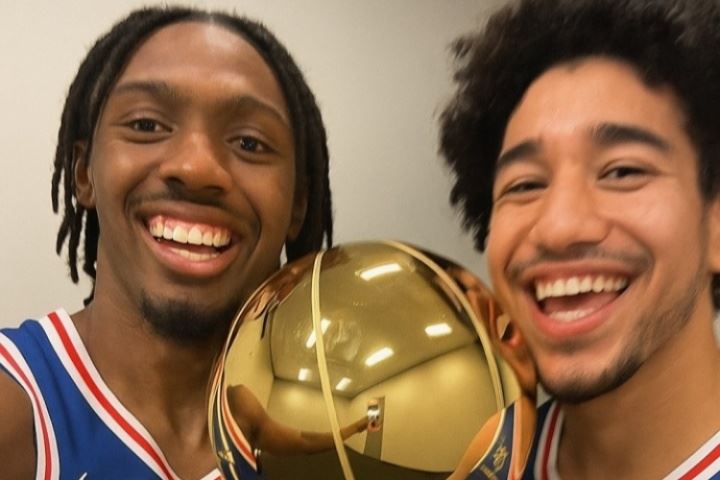 体育资讯07月28日讯 今日,76人后卫贾里德-麦凯恩在个人社交媒体上放出了一张他与队友泰瑞斯-马克西的AI夺冠合照。