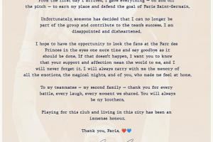 我希望能有机会再次在王子公园球场注视球迷们的双眼,以应有的方式道别。如果这无法实现,我想让你们知道,你们的支持与厚爱对我而言意义非凡,我永远不会忘记。我将永远铭记所有的情感、那些神奇的夜晚,以及你们——是你们让我感受到家的温暖。
