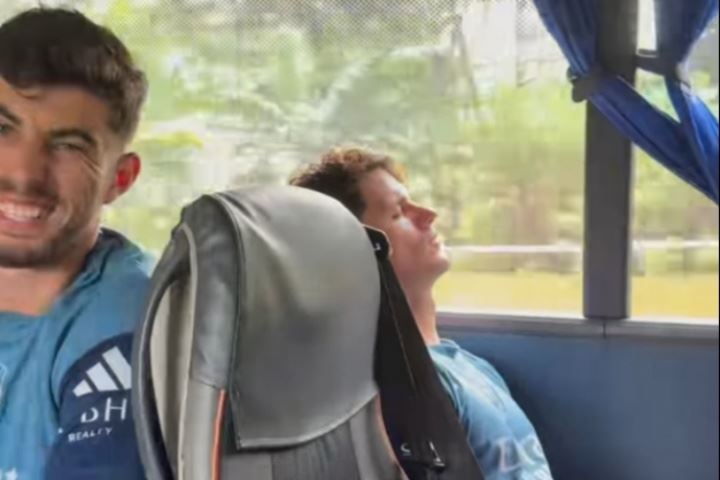 视频中阿森纳一众小年轻在大巴上唱跳打闹拍窗户,31岁的新援诺尔高只觉得吵闹,自己眉头紧锁闭目养神。
