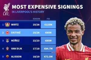 体育资讯7月24日讯 德国转会市场统计了利物浦引进新援的费用,并列出利物浦队史最贵引援榜,维尔茨居首,埃基蒂克、努涅斯二三位。