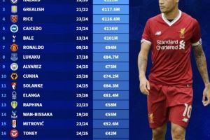 英超20支球队历史卖人纪录:库蒂尼奥领衔,阿扎尔、格拉利什在列
