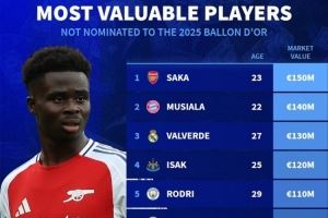 体育资讯8月8日讯 2025年金球奖候选名单出炉,德国转会市场统计了未获提名球员的身价,并列出榜单,萨卡、穆西亚拉、巴尔韦德前三位。